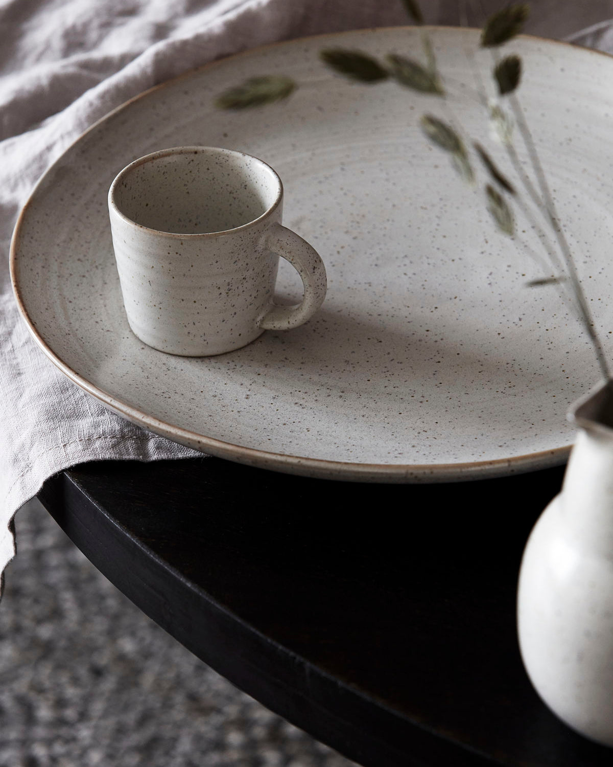 With its soft grey-and-white glaze and delicate speckled surface, the Pion Cup turns an everyday ritual into a small moment of beauty. The smooth stoneware and generous handle make it a pleasure to hold, while the subtle variations in finish ensure each piece feels quietly unique.